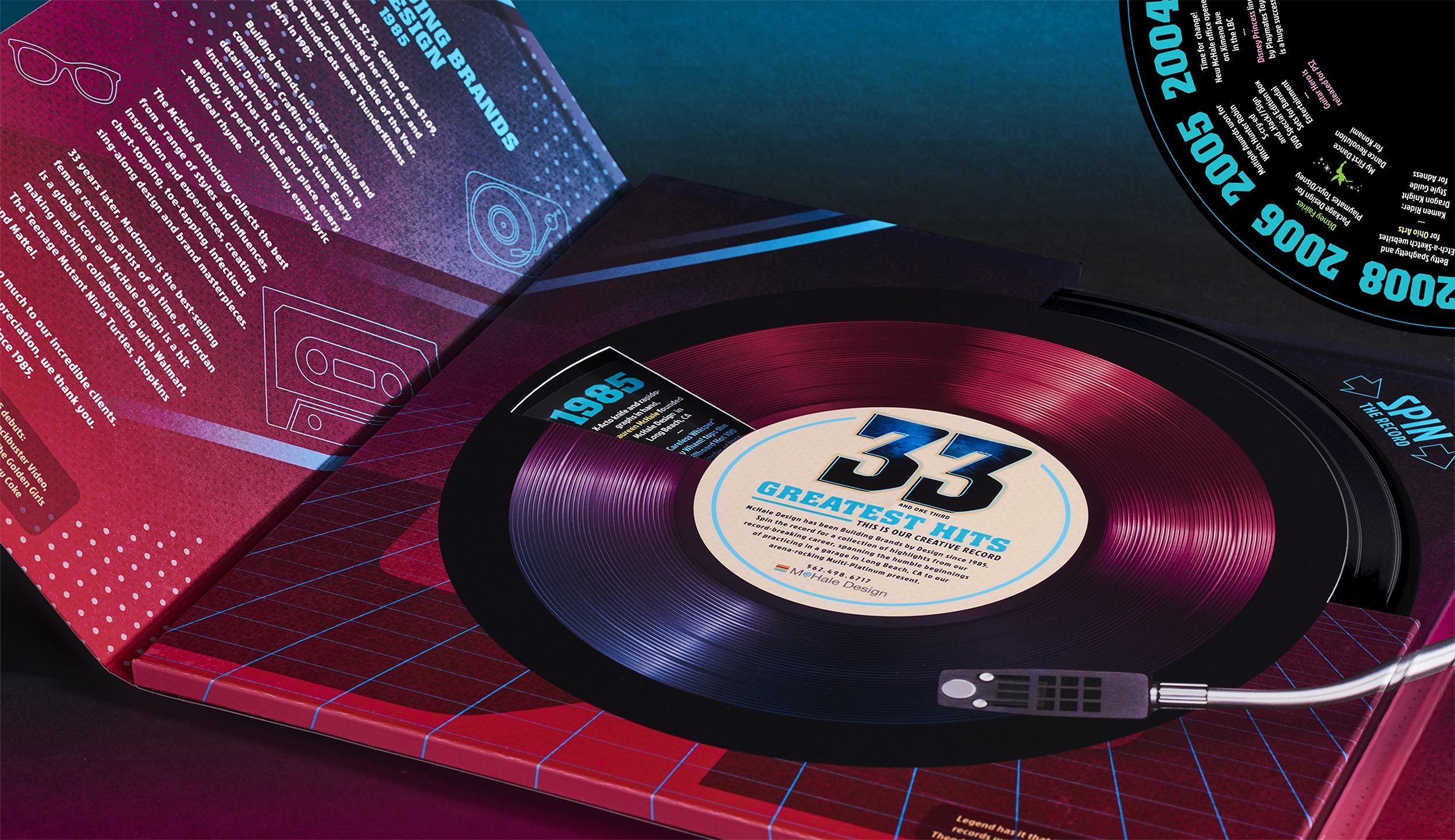 To celebrate our 33 1/3rd year anniversary, McHale Design conceived a self-promo campaign inspired by the music of 1985, the year we were born; 33 1/3rd Greatest Hits, a full-size gatefold record cover opening to an actual vinyl record which spins to reveal landmark dates in McHale Design’s history.